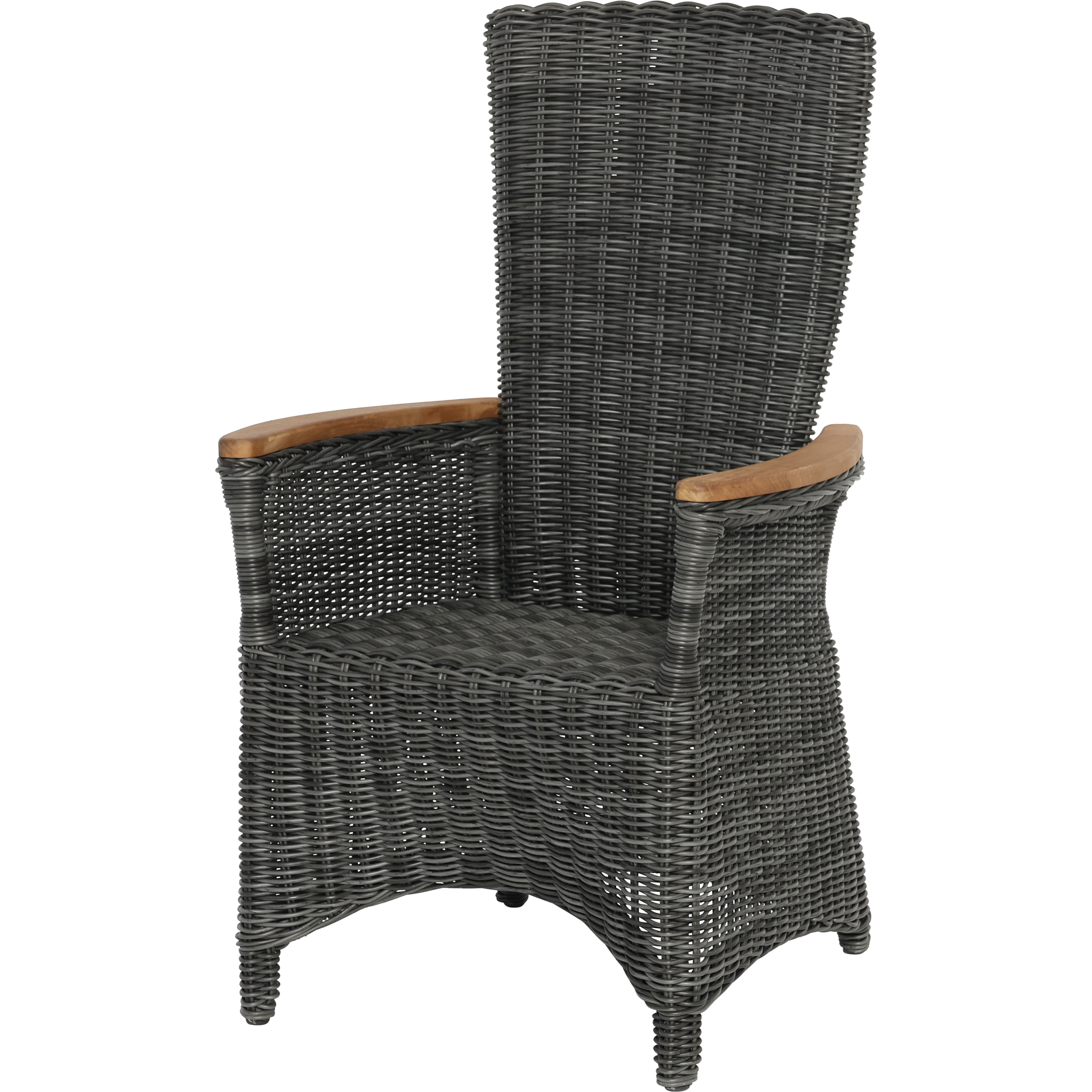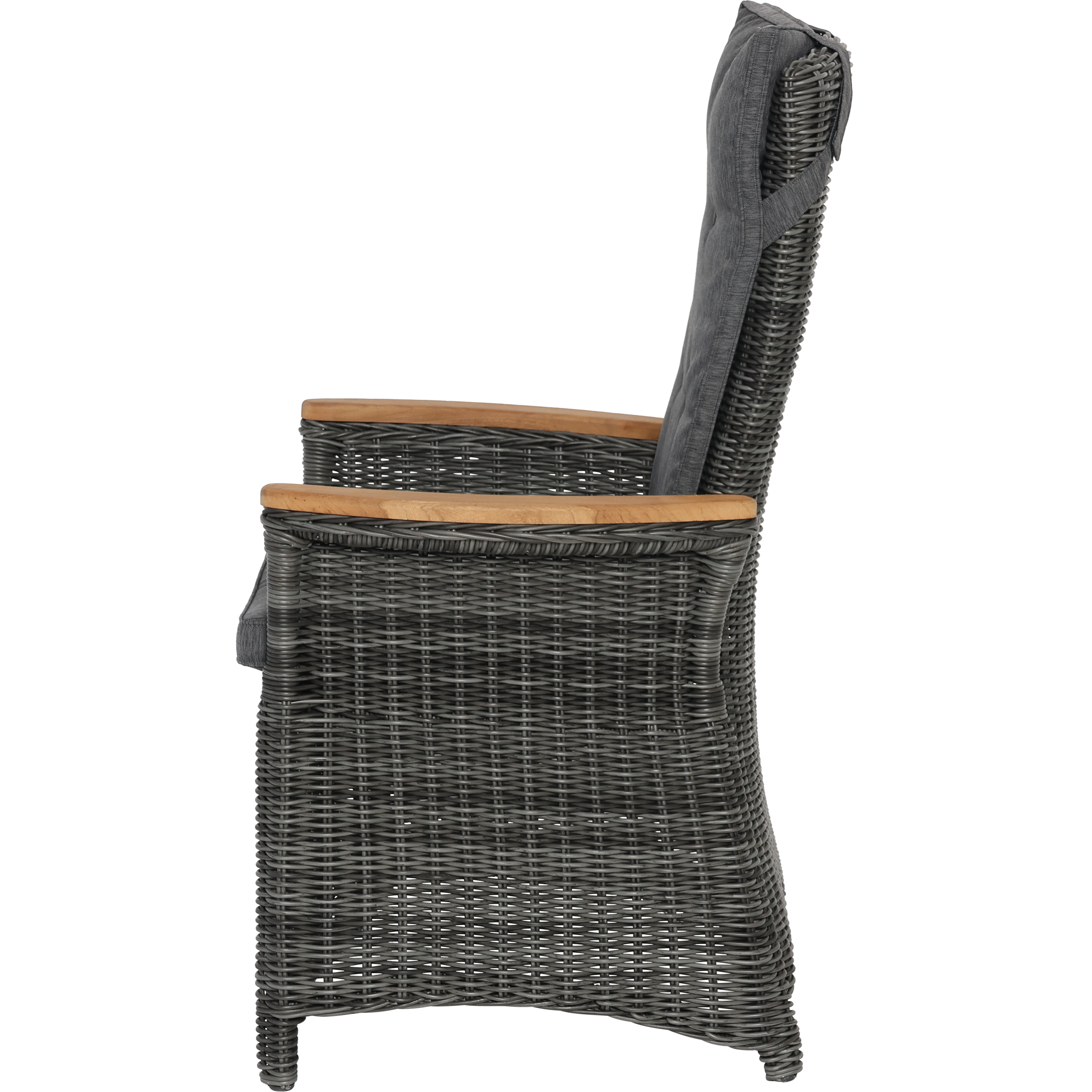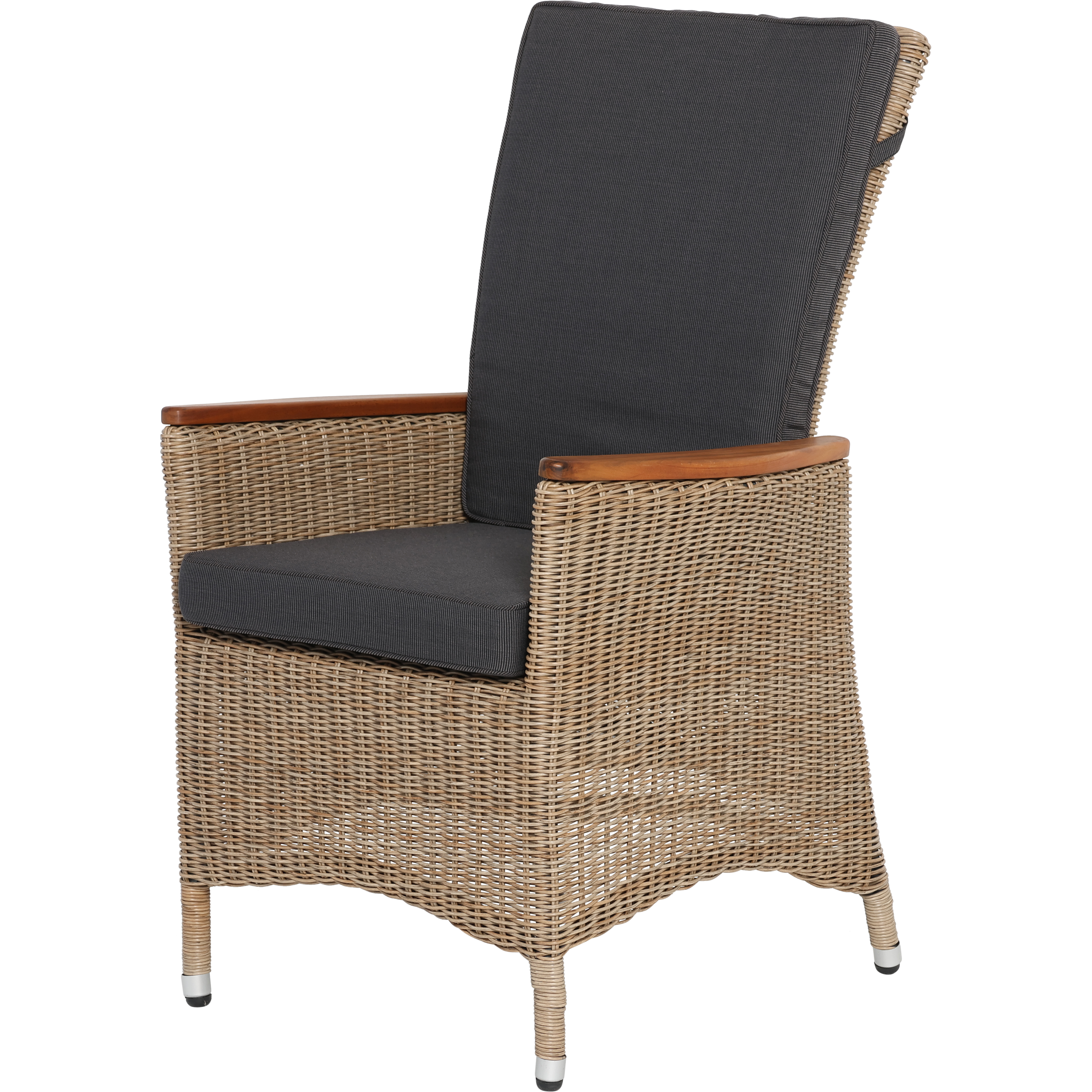 Komfortabler Polyrattan-Verstellstuhl mit hoher Rückenlehne, Armlehnen aus Teakholz, seitlichem Griff zur einfachen Bedienung und inkludiertem Polster. Wetterfest, pflegeleicht und ideal für Garten, Terrasse oder Balkon.