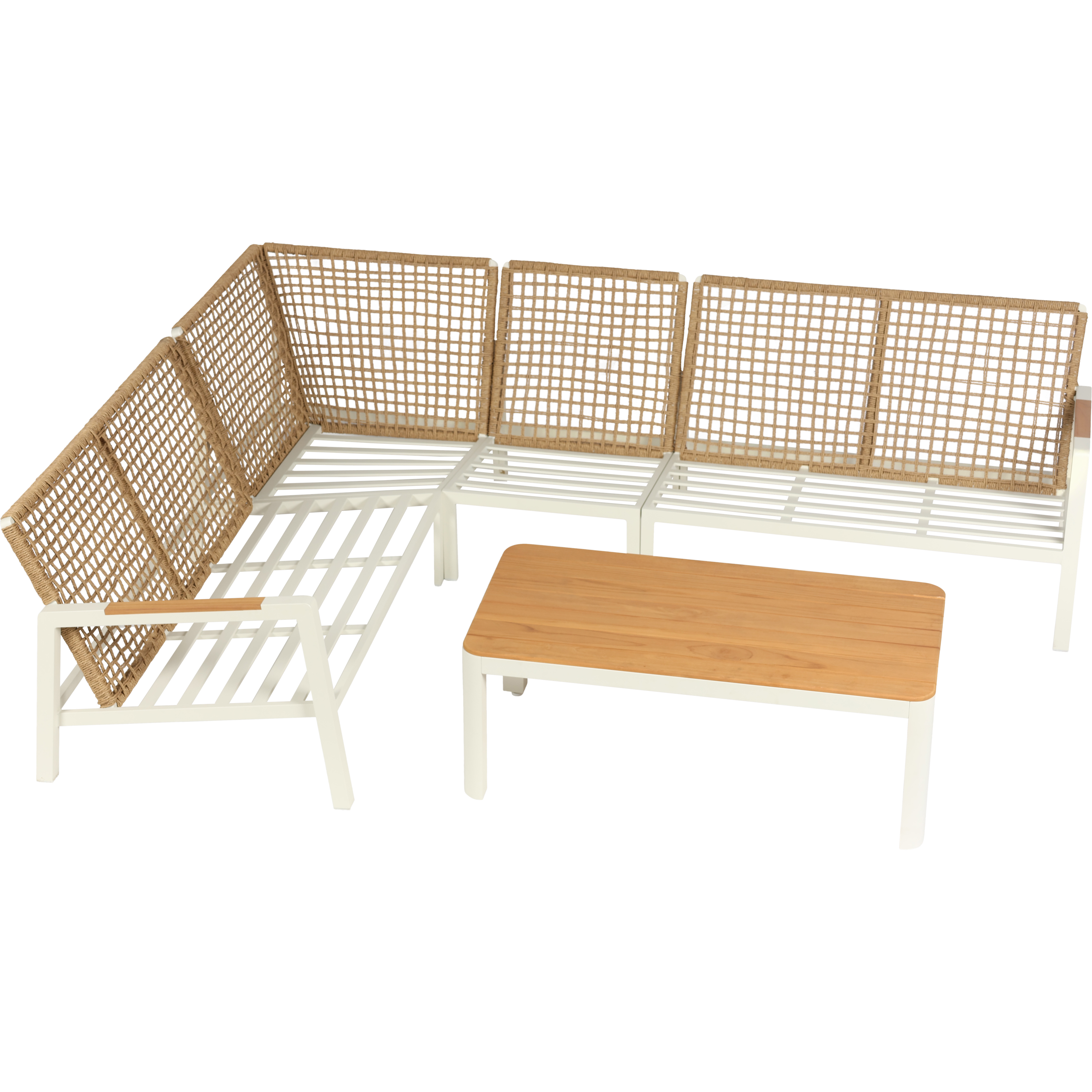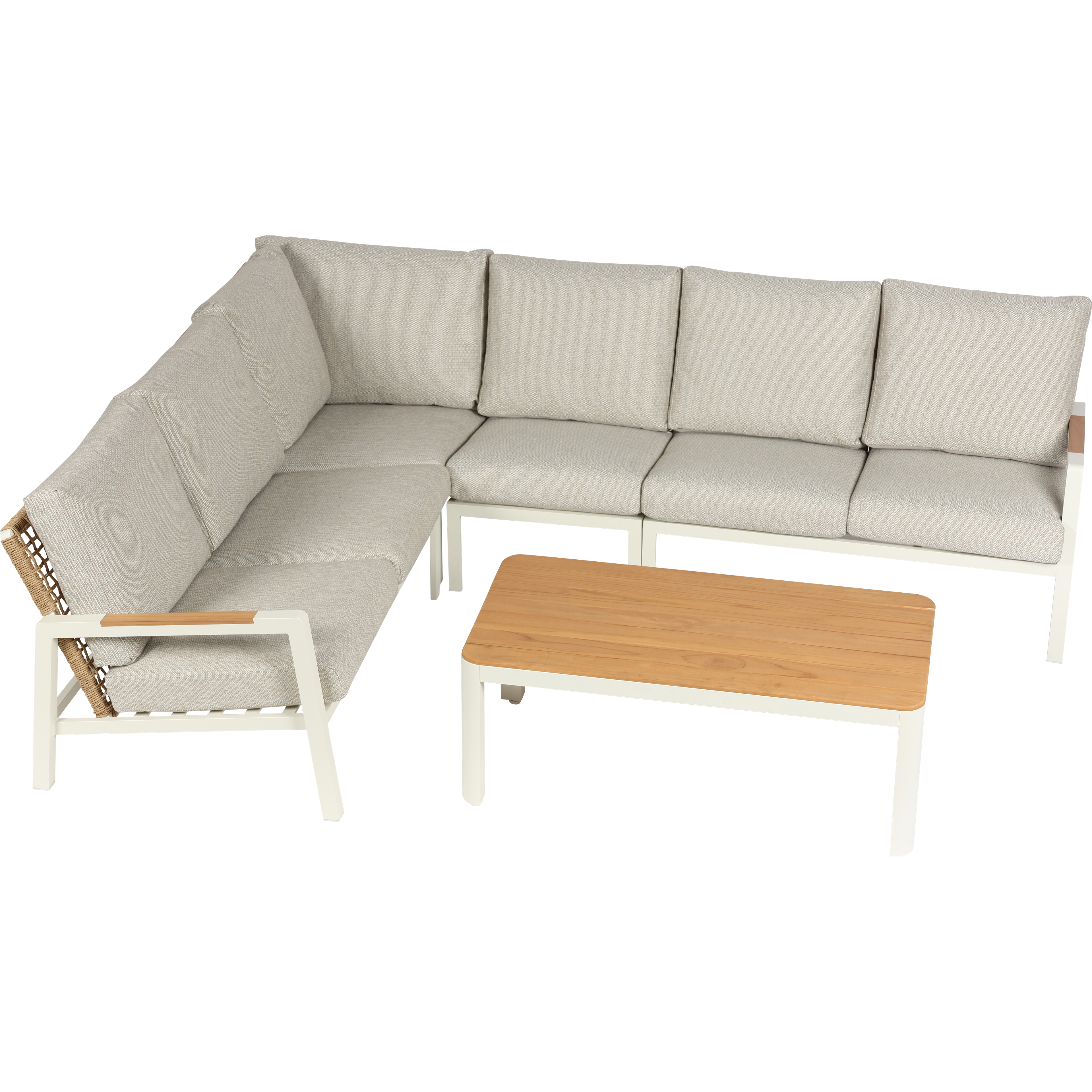 Die Verona Ecklounge kombiniert ein pulverbeschichtetes Aluminiumgestell mit Twisted Wicker Geflecht und Teakholz-Armlehnen. Mit großzügigen Maßen bietet sie viel Platz und hohen Komfort für den Außenbereich. Ideal für stilvolle und langlebige Lounge-Bereiche im Garten oder auf der Terrasse.