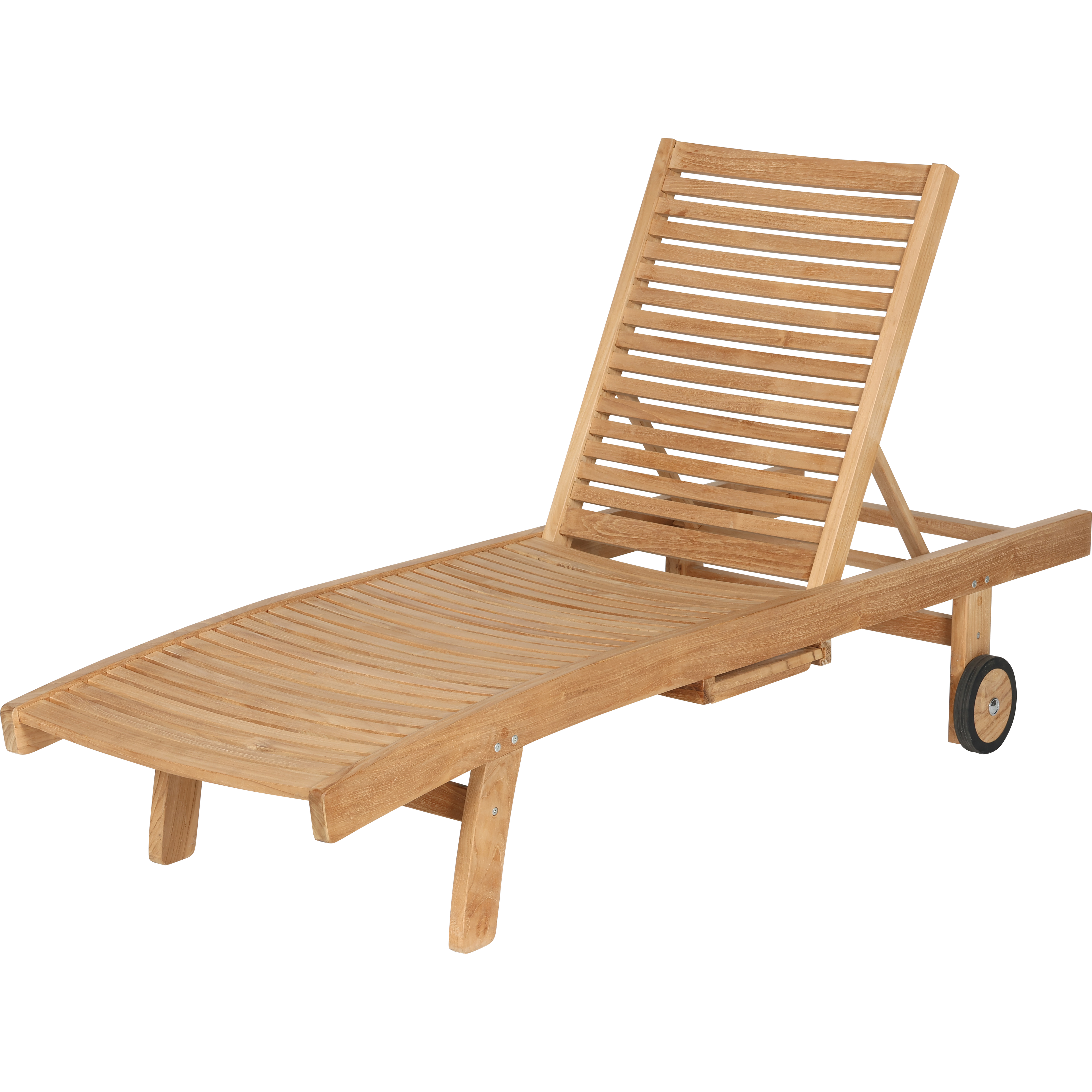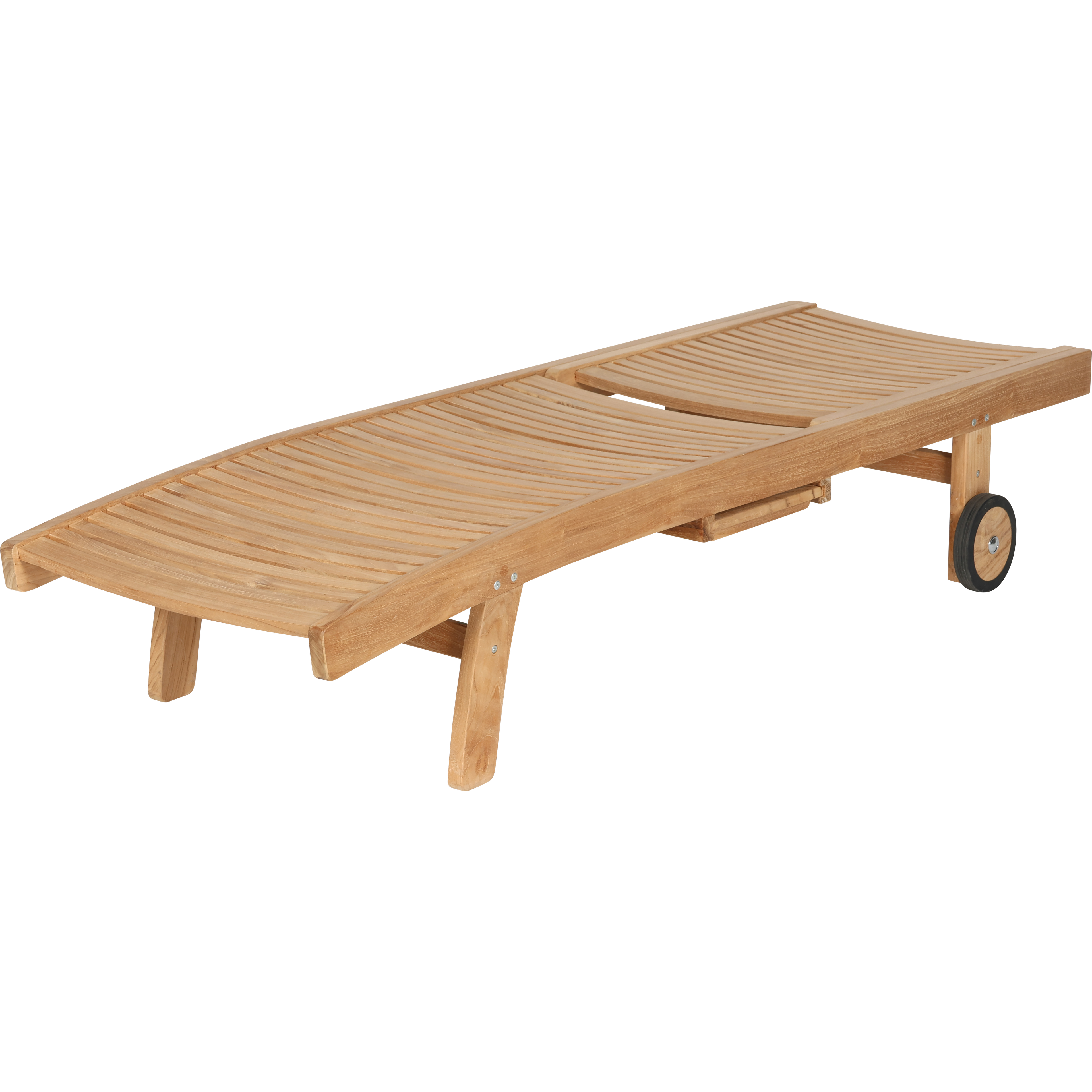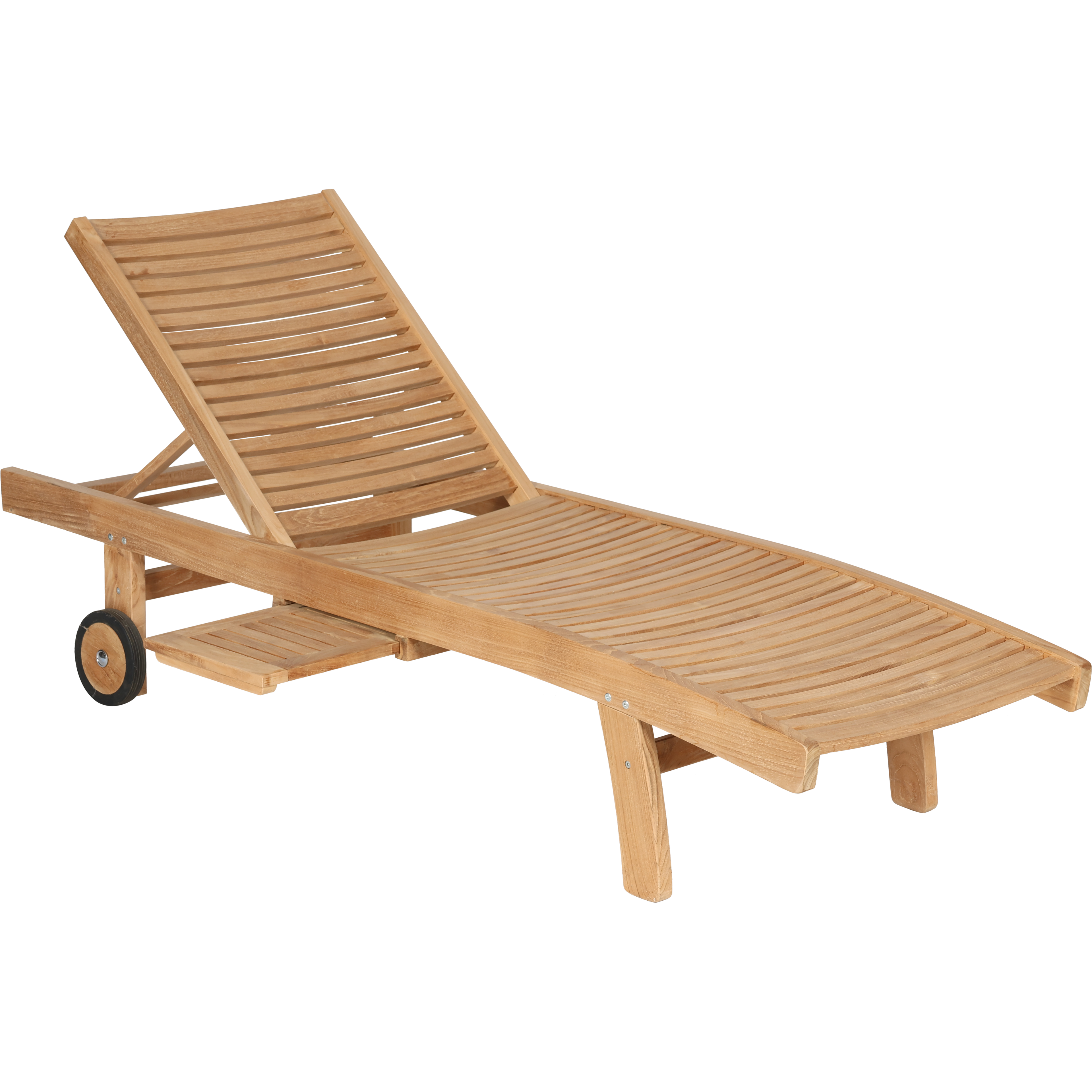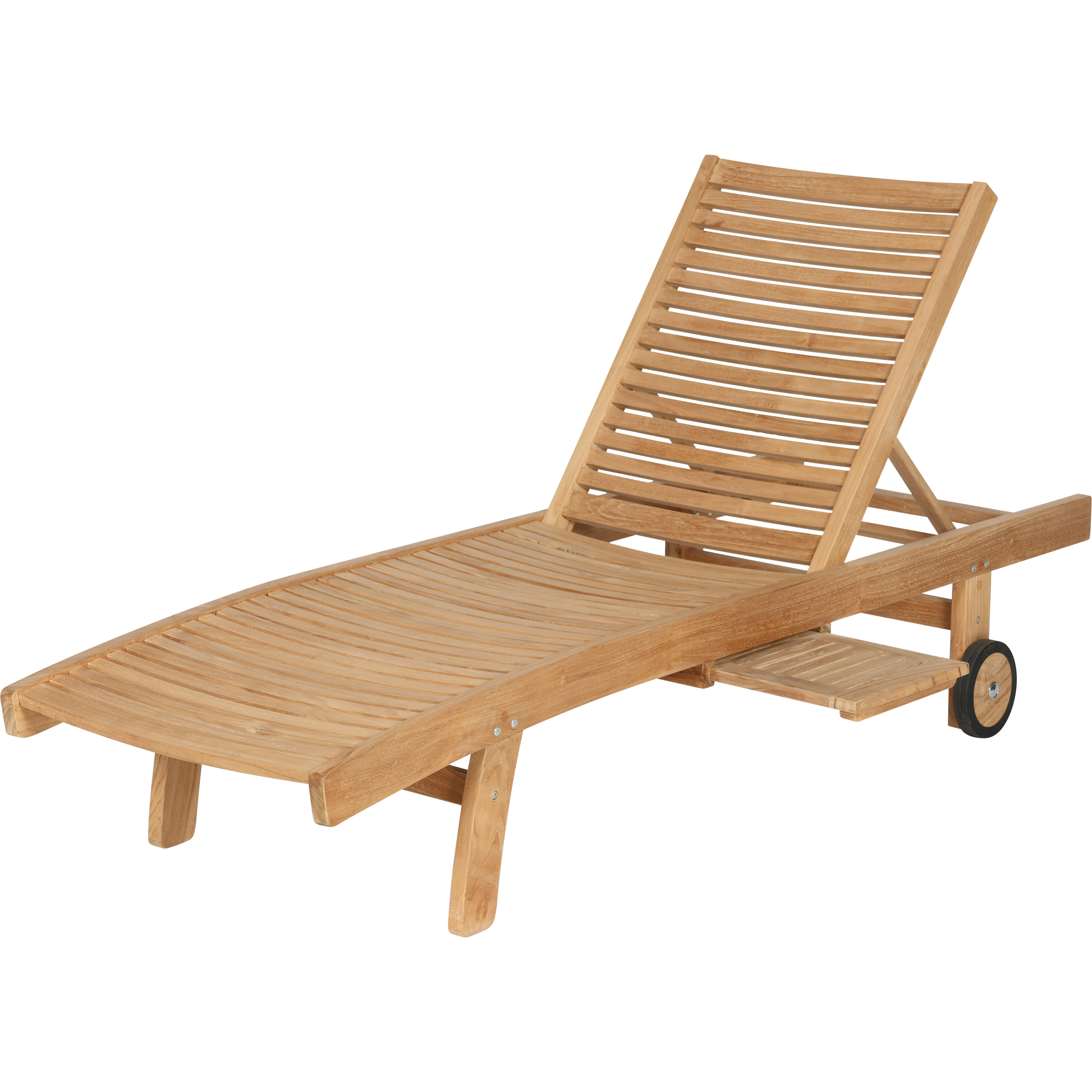 Teakliege mit verstellbarer Rückenlehne, Rollen und einem seitlichen Ausziehtisch (wahlweise links oder rechts). Robust, wetterbeständig und pflegeleicht.