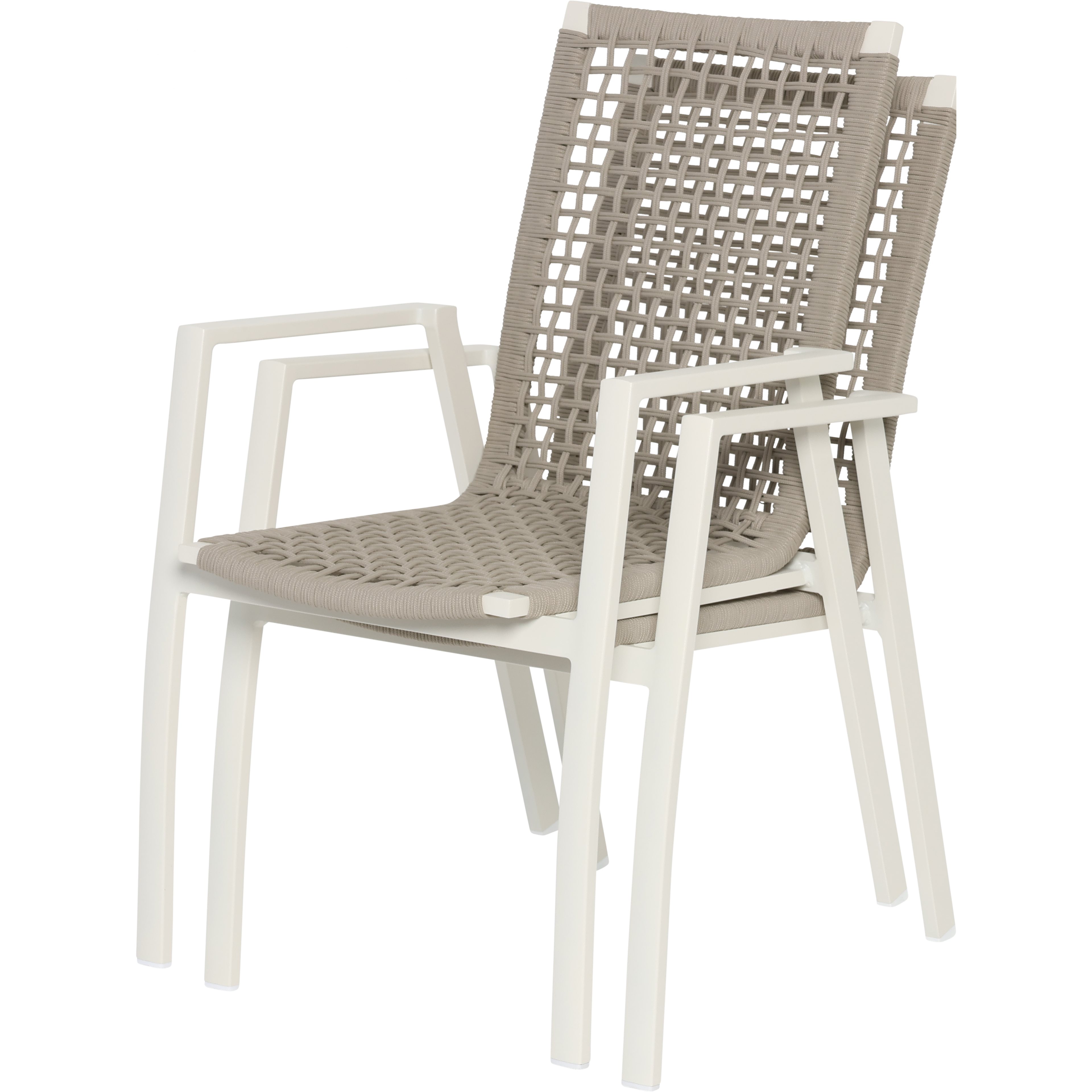 Stapelbarer Outdoor Stuhl mit pulverbeschichtetem Aluminiumgestell und Rope Geflecht Bespannung.