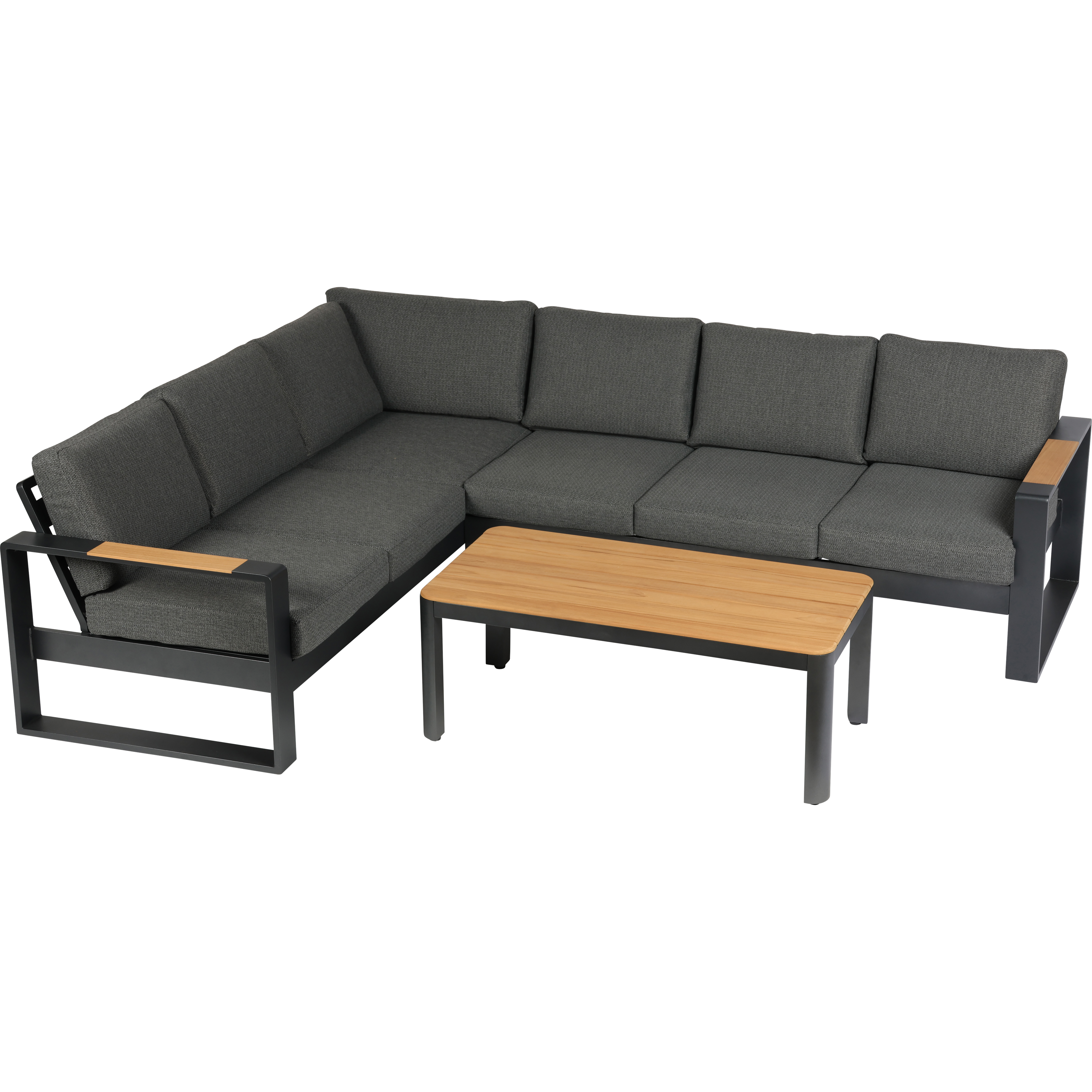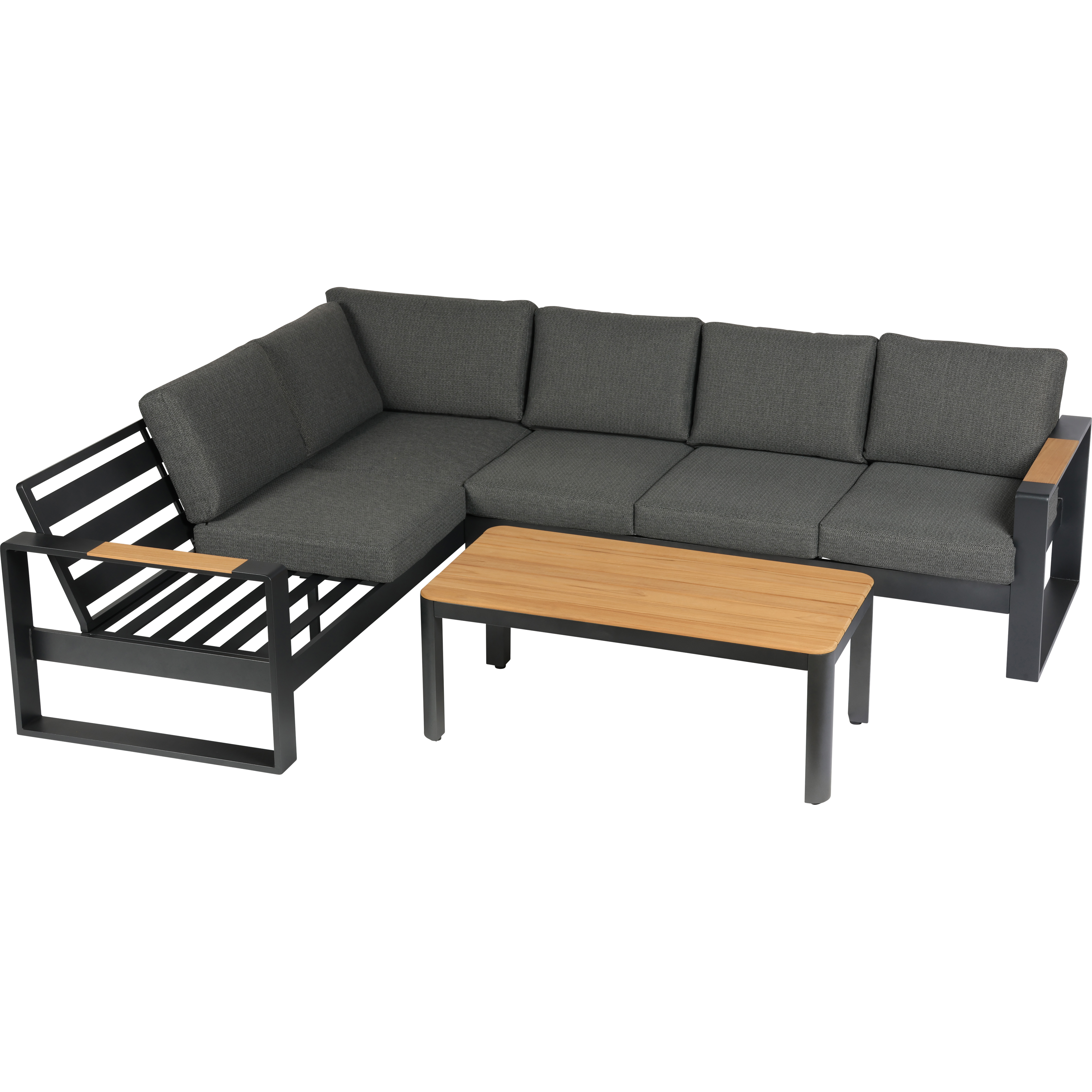 Die Palermo Ecklounge bietet mit ihrem Aluminiumgestell, integrierten Teakholz-Armlehnen und komfortablen Polstern eine moderne und stilvolle Sitzlösung für den Outdoorbereich. Durch ihre feste Ausrichtung und die großzügige Form eignet sie sich ideal für entspannte Stunden im Garten oder auf der Terrasse.